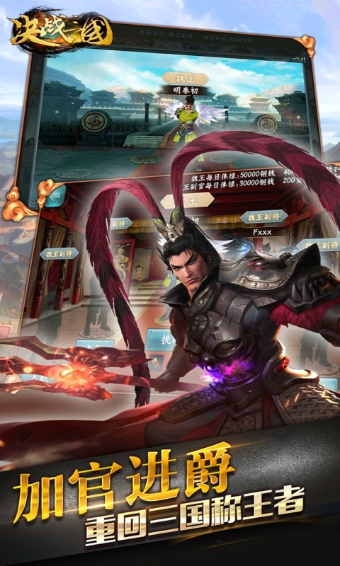 东汉末年,以曹操、孙权为首的魏、吴两国不断扩充势力,神州大地战火熊熊。一少年以平定天下为大任,带领一支义军于蜀中突起,识美人纳豪杰,与四方枭雄斗智斗勇,一步步登上三国霸主的金龙宝座。 《决战三国》画风细腻,玩法多样。在这里,你可以拥有自己的城池与臣民;在这里,五虎上将、诸葛军师,任你调遣;在这里,大型国战,多人实时互动。更有抵御蛮夷、征战世界等热血玩法,带你进入真实的三国世界。 《决战三国》带你穿越成帝王,体验坐拥貂蝉,统领吕布,决胜三国,一统江山!快来加入三国阵营,成就你的君王梦!