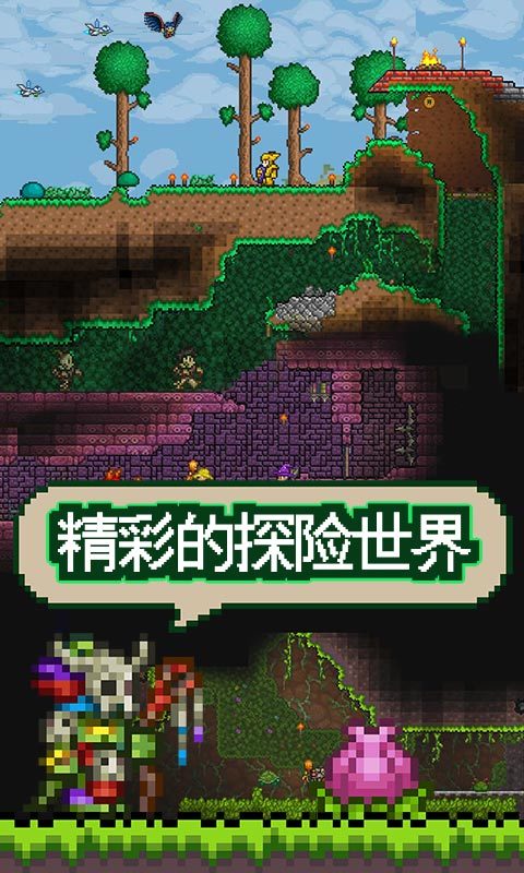 《泰拉瑞亚》是一款高自由度的沙盒游戏。玩家可以在游戏中做很多事情:制造武器战胜各种各样的敌人及群落;挖掘地下寻找器材配件、金钱和其他有用的东西;收集木材,石材,矿石等资源;用世界里的一切创造你需要的东西并守护它。 整个游戏世界都是可破坏的,破坏某些障碍物后,就可以找到各种资源比如石头、木材、铁矿或者其他装备,当然,在不断深入的同时,也会遇到各种怪物。游戏的主要任务就是让玩家利用各种资源按自己的想法创造出各种稀奇古怪的东西,整个世界充满了探索的动力。