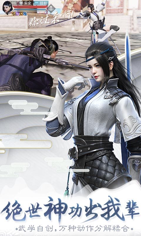 5、轻功战斗,逆转风云! 四段大轻功+水上轻功,自由来去!门派专属轻功战斗技能,全新的Z轴操作感,腾挪闪避、飞跃冲刺、凌空放招,飞得好看,打得更好看。论剑竞技,势力争锋,丰富对抗体验助你逆转武林风云!