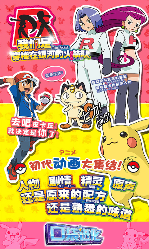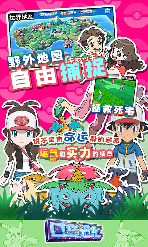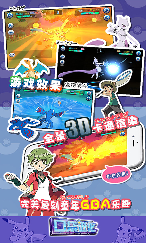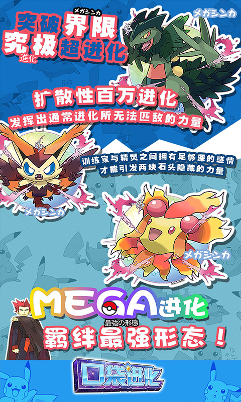 《口袋进化》是一款口袋妖怪精灵收集养成类的卡牌手游。游戏深度还原了原版口袋妖怪剧情冒险、精灵战斗、精灵捕捉收集、社交等特色元素。游戏中的口袋妖怪采用精美的3D风格,原创绚丽的技能,无论是从剧情、人物、建筑画面,还是地图都深度还原原版口袋妖怪。游戏收录了7个世代的精灵,精灵进化、mega超进化、亲密度养成、精灵骑行、树果系统等超多元素。战斗精灵1v1、组队pk,全屏爆裂引燃。快带上你的宝可梦,踏上最强训练师的旅程吧!