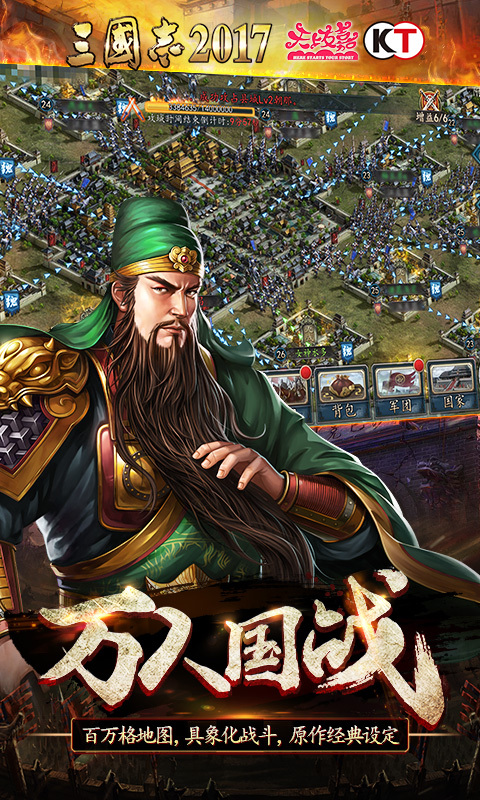 《三国志2017》由光荣特库摩经典单机游戏《三国志11》授权改编,不仅保留了原作大气磅礴的3D写实风格画面,同时引入万人同图竞技新模式,力求打造出别具一格的游戏体验。在游戏中,各位主公大人可修建城池、招募名将,体验割据一方的乐趣,也可缔结联盟、拓展版图,完成一统中原的伟业。再现SLG烧脑火拼盛况,万人国战即刻起航!