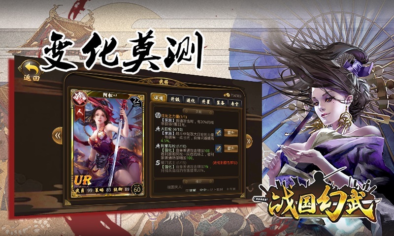《战国幻武》是一款以日本战国时代为背景的卡牌即时战略游戏, 游戏以日本1560年战国时期为背景,玩家将和众多知名的日本战国时期历史人物一起,在局势瞬息万变的战场上列阵、夹击,或是偷袭敌人;通过数十种原创战法(技能)扭转战场,取得胜利。