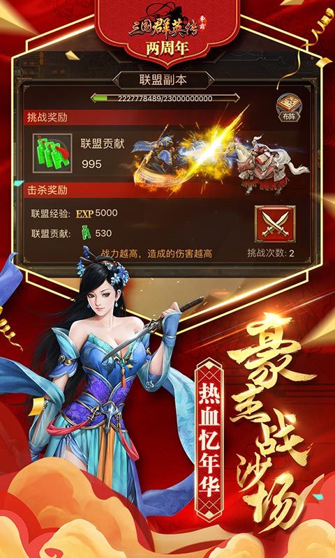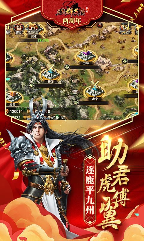 【周年送福利】 万千元宝任性送,七天送橙将,刘备、小乔、荀、华佗三国强力辅助四选一。两周再送稀有红将,神兵天降战力飙升,率武神关羽狂扫一方!