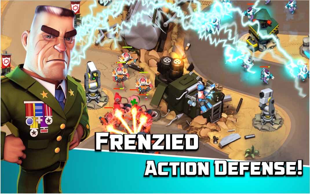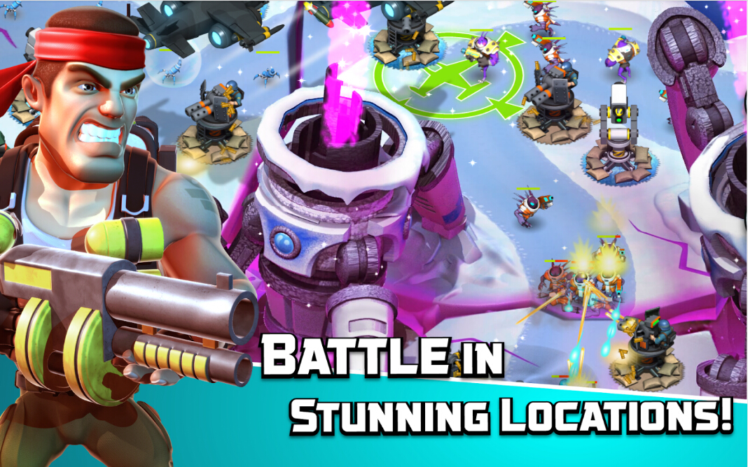游戏背景设定在外太空,虽然剧情依旧是老套的人与外星入侵者的战争,但是本作画面色彩艳丽,细节出众,不同场景地图都各具特色,辨识度也相当高。防御塔的造型经典,小兵们虽然略微迷你,但是线条依旧清晰。战斗时的背景音乐也会使得玩家更加提神。