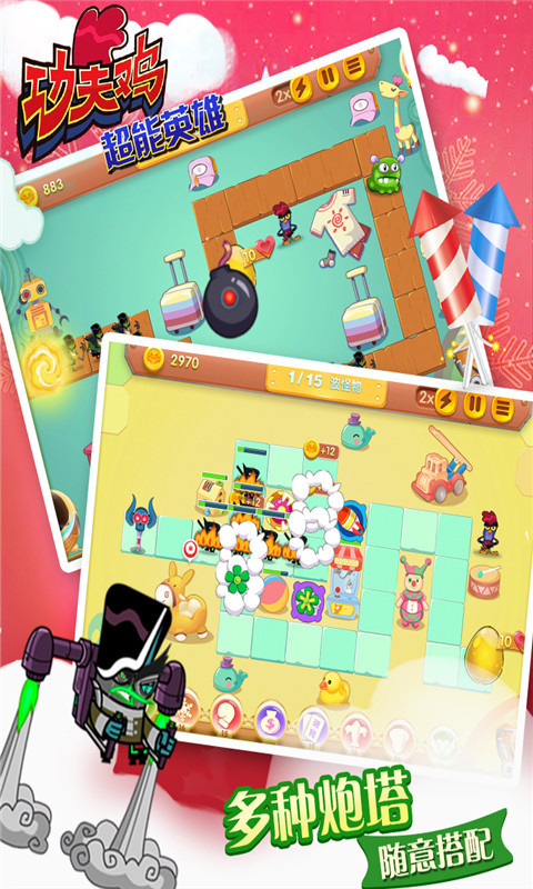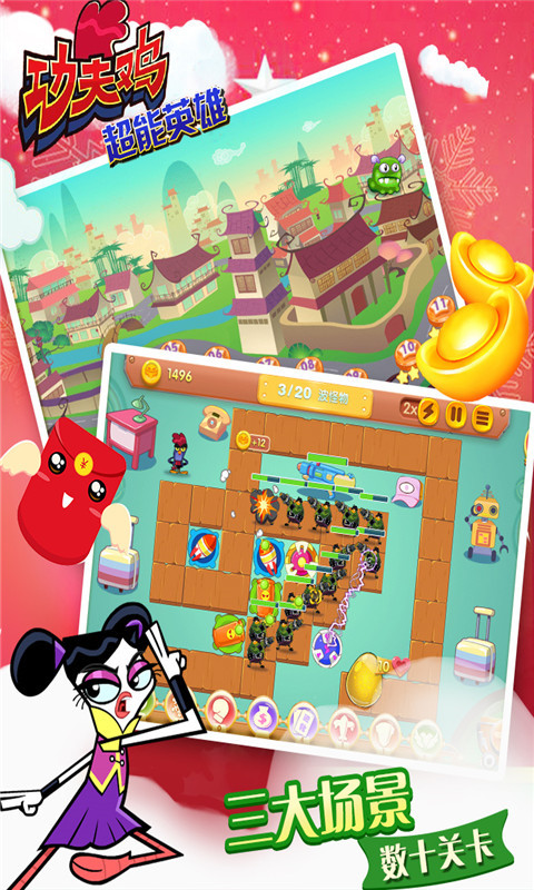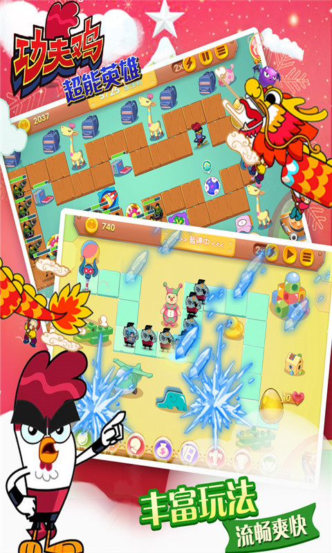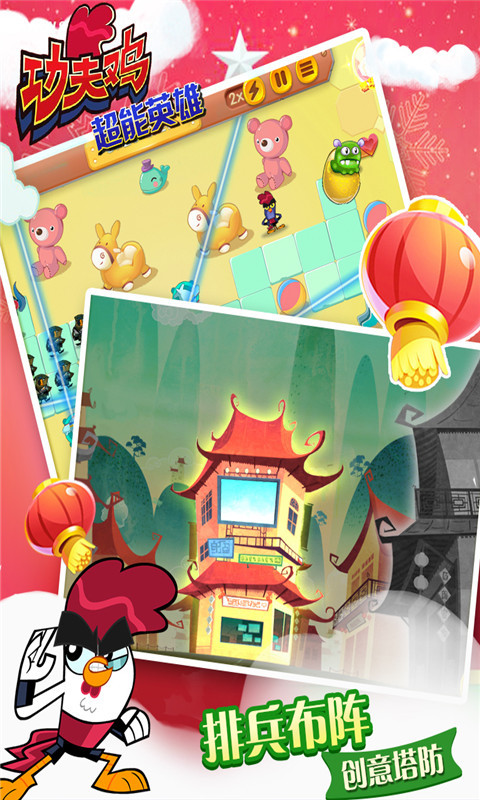 《功夫鸡-超能英雄》是一款益智塔防类游戏,故事发生在一个只有鸟,鸡,鸭等小飞禽的名叫岩石栖息地的小岛上,在这个岛上有一颗神奇的金蛋,为了保护这颗金蛋,鸡仔和他的朋友们需要抵御住反派的进攻。而玩家将和鸡仔一起,在游戏中击败那些前来抢夺金蛋的反派。