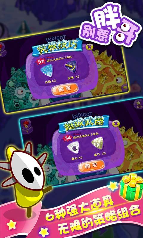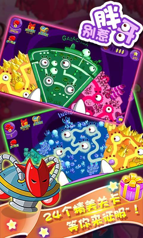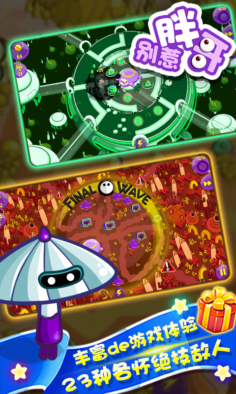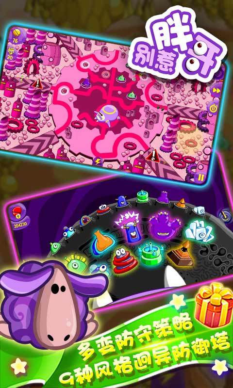 《别惹胖哥》的画面为非常个性的2D画面,艺术成分很高。每一个场景都采用不同颜色的色调,而且色彩非常艳丽梦幻且充满整个场景,看上去十分养眼而且具有特色。主角、怪物、炮塔和各类元素的设计也都很有想法,和场景一样充满了制作组的个人特色,非常棒。