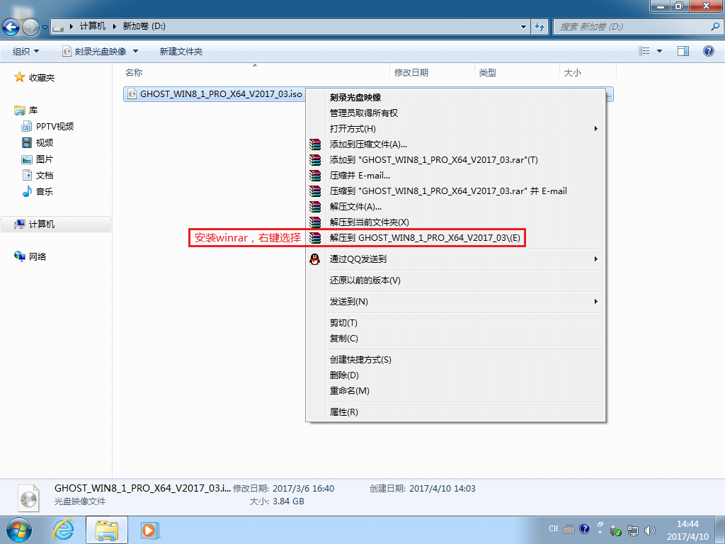 1、首先下载Ghost Win8系统镜像“GHOST_WIN8_1_PRO_X64_V2017_03.iso”到本地硬盘上(这里下载在D盘上), 下载完打开文件所在目录,选择文件,用右键解压到GHOST_WIN8_1_PRO_X64_V2017_03(建议用winrar),如下图;