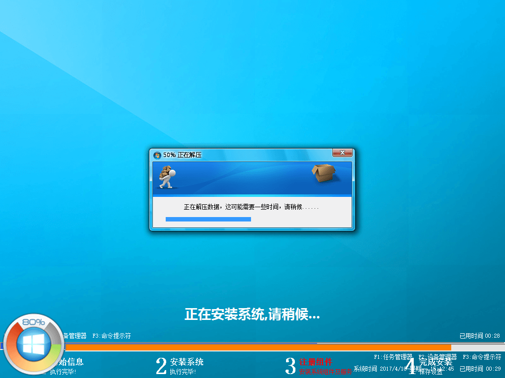 5)接下来会出现一个正在解压GHO的窗口,该窗口有进度条,此时我们无需做任何操作,只需耐心等待其完成即可,如下图所示: