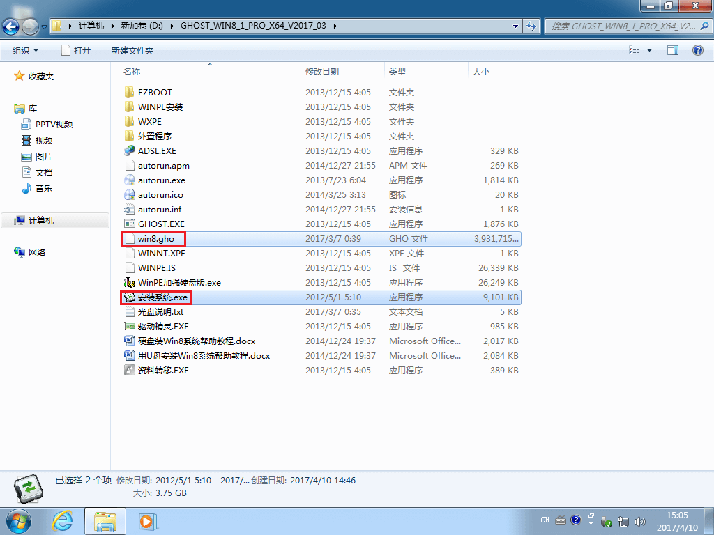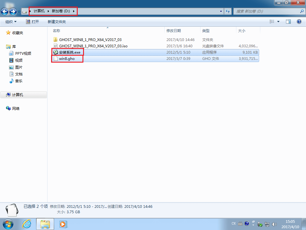 2、把“WIN8.GHO”和“GHO镜像安装器(安装系统或硬盘安装)”两个文件剪切到磁盘根目录下,这里选择放在D盘里;