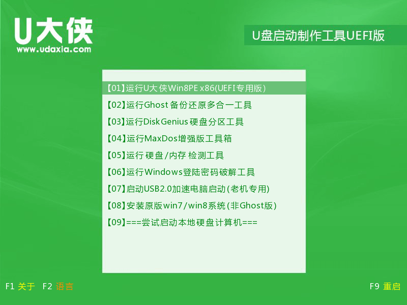 1)当我们利用按快捷键选择您的U盘启动进入到U大侠主菜单后,按上下↑↓方向键选择到"【01】 运行U大侠Win8PEx86精简版(支持UEFI)",然后按下"回 车键",将进入U大侠Win8PE系统,如下图: