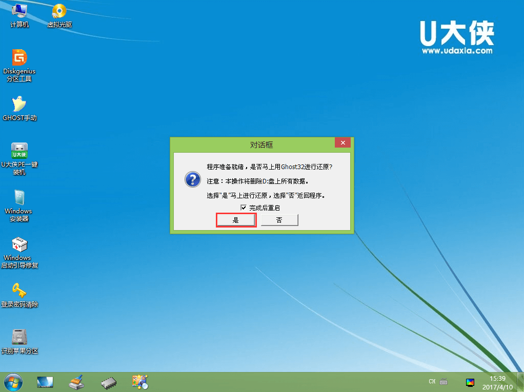 4)当点击"开始"按钮后会弹出一个小窗口,我们只需继续点击该弹出窗口的"是"按钮即可,如下图: